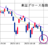 東証グロース指数は、火曜の三角持ち合い下放れ後の下落トレンドを継続。10日線との乖離が5%を超えているため、相応のリバウンド余地を内包。